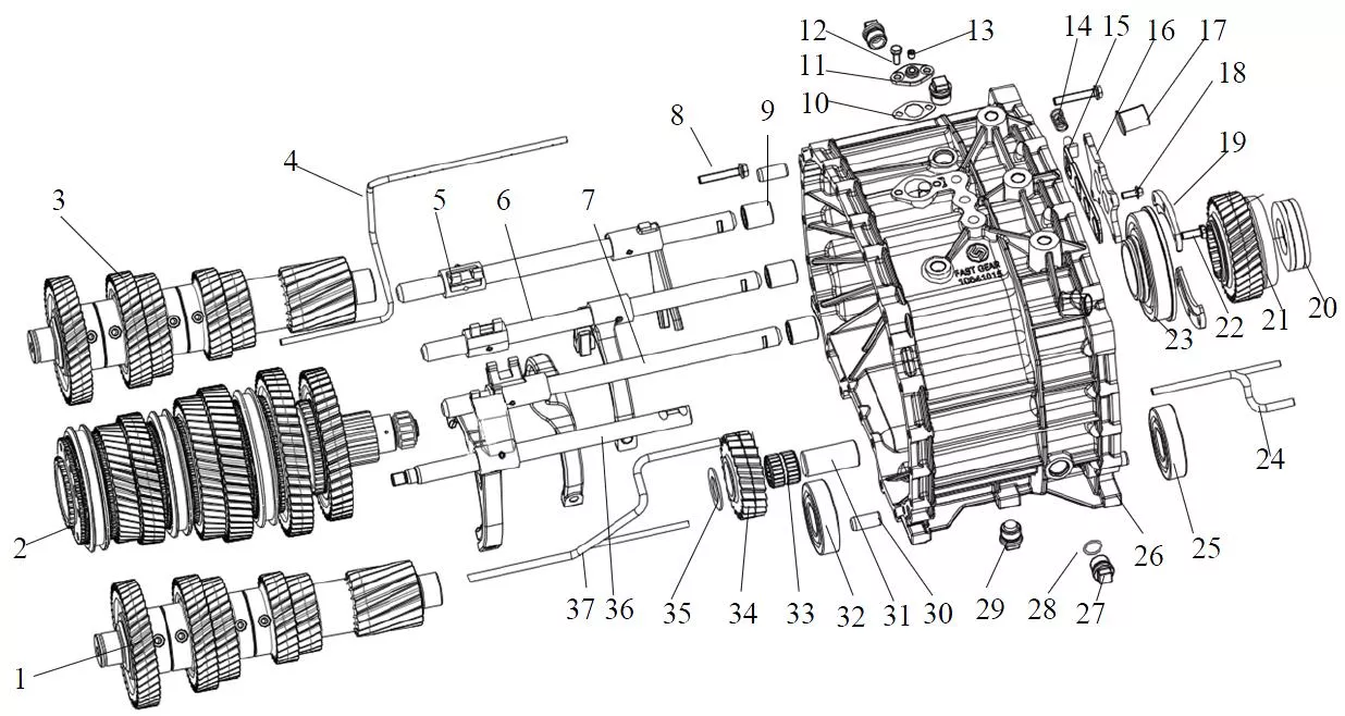 FAST 12-speed MT series transmission have different models, with code J in the model name means mechanical transmission, with code S in the model name means transmission with Double Intermediate Shaft design.